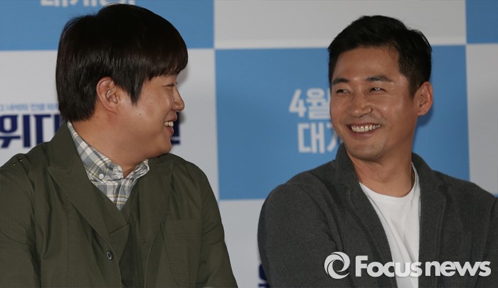 (서울=포커스뉴스) 7일 오후 서울 광진구 건대입구 롯데시네마에서 열린 영화 '위대한 소원' 언론시사회에 참석한 배우 안재홍(왼쪽)과 전노민이 환한 미소를 짓고 있다.