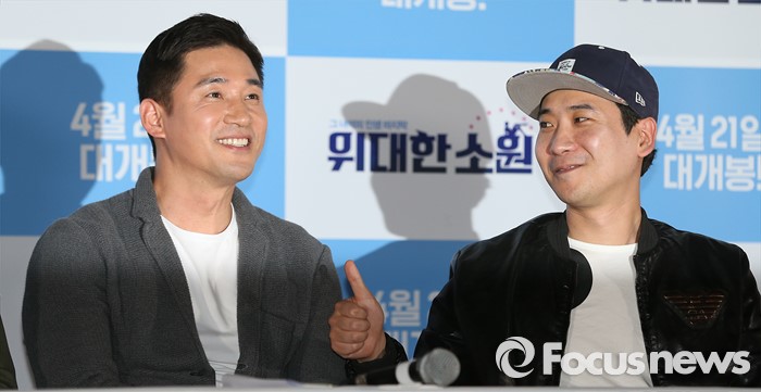 (서울=포커스뉴스) 7일 오후 서울 광진구 건대입구 롯데시네마에서 열린 영화 '위대한 소원' 언론시사회에 참석한 배우 전노민(왼쪽)과 남대중 감독이 취재진에게 질문을 받고 있다.