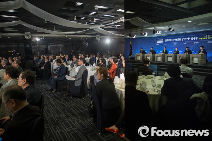 (서울=포커스뉴스) 7일 오후 서울 종로구 세종문화회관에서 열린 한국방송기자클럽 초청토론회에 참석한(오른쪽 세번째) 강봉균 새누리당 공동선거대책위원장이 패널들과 토론을 하고 있다.