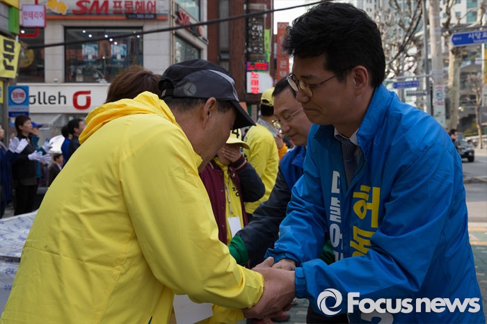 (서울=포커스뉴스) 20대 총선을 6일 앞둔 7일 오후 서울 동작구 남성역 골목시장 인근에서 허동준 더불어민주당 동작구을 후보가 정의당 당원들과 악수를 하고 있다.