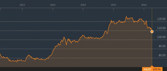 7일 역외시장(한국시간 오후 3시 36분 현재) 에서 엔·달러 환율은 108.96엔에 거래되고 있다. 지난 5일 런던 외환시장에서 엔·달러 환율이 110엔 아래(109.95엔)에서 거래된 지 2거래일만에 엔화 가치가 더 오른 것이다. 달러화 대비 엔화 가치가 108엔까지 올라간 것은 2014년 10월 30일 108.78엔을 기록한 이후 1년 6개월만이다.