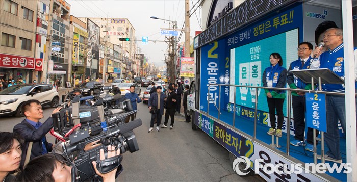 (충주=포커스뉴스) 김종민 더불어민주당 대표가 7일 오후 충북 충주 중앙로에서 윤홍락 후보의 지지를 호소하고 있다.