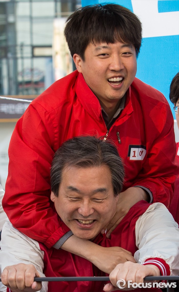 (서울=포커스뉴스) 7일 오후 서울 노원구 롯데백화점 인근에서 이준석 새누리당 노원구병 후보 지원유세에 나선 김무성 대표가 이 후보를 업어주고 있다.