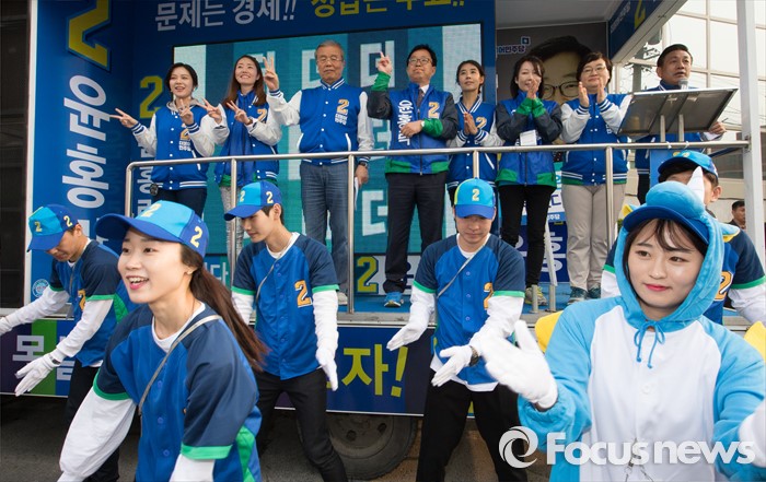(충주=포커스뉴스) 김종인 더불어민주당 대표가 7일 오후 충북 충주 중앙로에서 지원유세를 나와 윤홍락 후보 지지를 호소하고 있다.