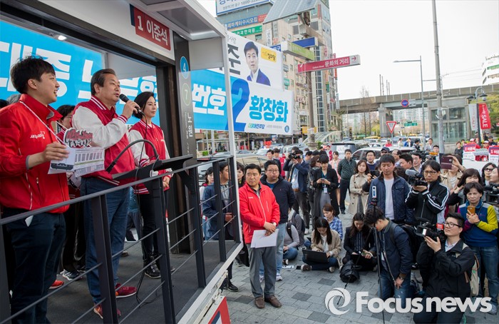 (서울=포커스뉴스) 7일 오후 서울 노원구 롯데백화점 인근에서 이준석 새누리당 노원구병 후보 지원유세에 나선 김무성 대표가 유권자들의 지지를 호소하고 있다.