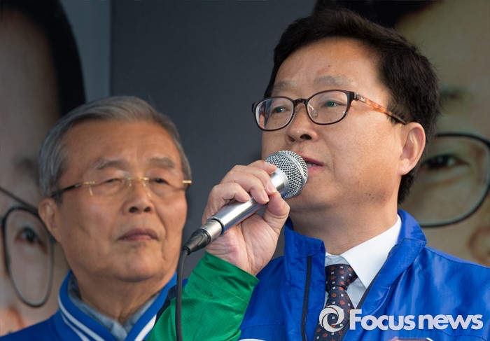 (충주=포커스뉴스) 7일 오후 충북 충주 중앙로에서 김종민 더불어민주당 대표가 지원유세를 나온 가운데 윤홍락 후보가 지지를 호소하고 있다.