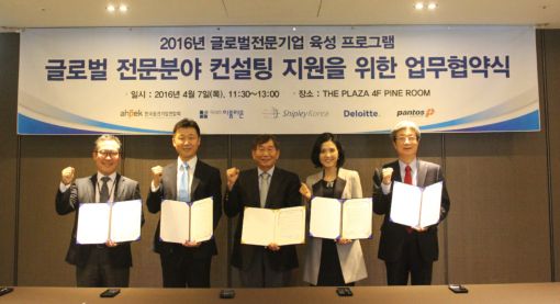'글로벌 전문분야 컨설팅'은 신청서를 접수한 글로벌 전문 후보기업과 '월드클래스300' 기업을 대상으로 4월부터 순차적으로 진행할 예정이다.왼쪽부터 김용기 쉬플리코리아 대표, 이용호 범한판토스 전무, 김규태 중견련 전무, 안미정 특허법인 이룸리온 대표, 이정희 딜로이트 안진회계법인 본부장이 MOU 체결 후 기념촬영을 하고 있다.<사진제공=중견련>