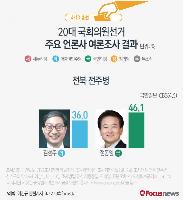 전주병은 김성주 더불어민주당 후보와 정동영 국민의당 후보가 여론조사 결과가 발표될 때마다 오차범위 내에서 접전을 펼치며 순위가 뒤바뀌고 있다.