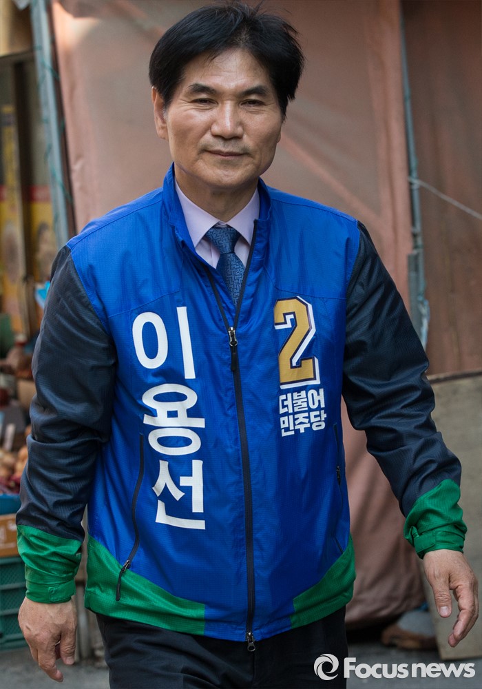 (서울=포커스뉴스) 이용선 더불어민주당 양천구을 후보가 7일 오후 서울 양천구 신월동 신월시장에서 선거운동을 하고 있다.