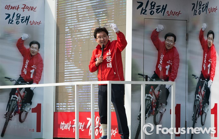 (서울=포커스뉴스) 김용태 새누리당 양천구을 후보가 7일 오후 서울 양천구 신월동 일대에서 선거운동을 하고 있다.