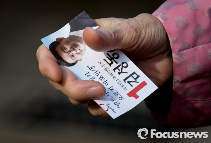 (서울=포커스뉴스) 7일 오후 서울 경성고등학교 앞 사거리에서 한 시민이 선거운동원으로부터 받은 20대 총선에 출마하는 김성동 새누리당 서울 마포을 후보의 명함을 들고 있다.