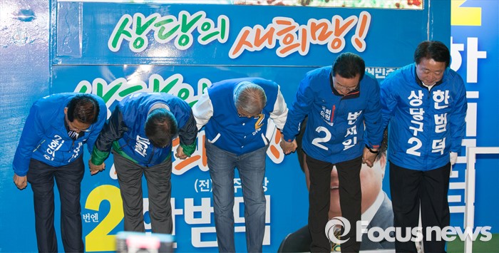 (청주=포커스뉴스) 김종민 더불어민주당 대표가 7일 오후 충북 청주 상당구 성안길에서 청주시 후보에 대한 지지를 호소하고 있다.