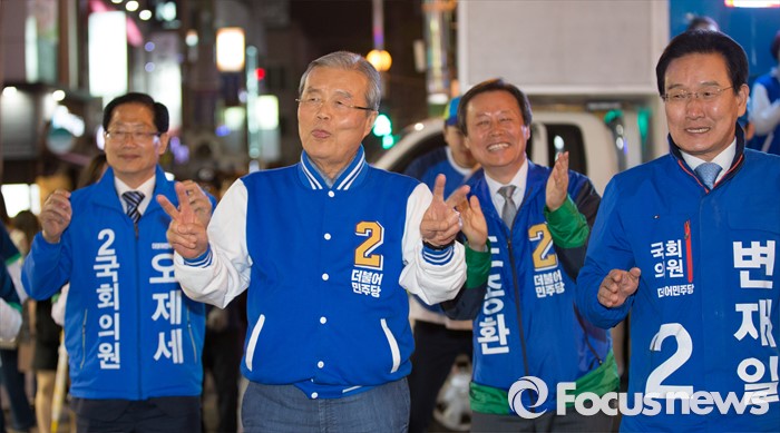 (청주=포커스뉴스) 김종민 더불어민주당 대표가 7일 오후 충북 청주 상당구 성안길에서 율동을 하며 청주시 후보에 대한 지지를 호소하고 있다.