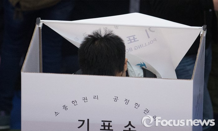 (인천공항=포커스뉴스) 제20대 국회의원 선거 사전투표 시작일인 8일 오전 인천국제공항 출국장에서 한 유권자가 사전투표를 하고 있다.