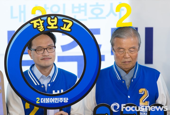 (서울=포커스뉴스) 김종인(오른쪽) 더불어민주당 비대위 대표 겸 선대위원장이 8일 오전 서울 은평구 응암로 박주민 은평구갑 후보 사무실에서 중앙선거대책위원회 회의 전 박(왼쪽) 후보와 2번 머리띠를 착용하고 지역 어르신들과 기초노령연금인상 공약 퍼포먼스를 하고 있다.