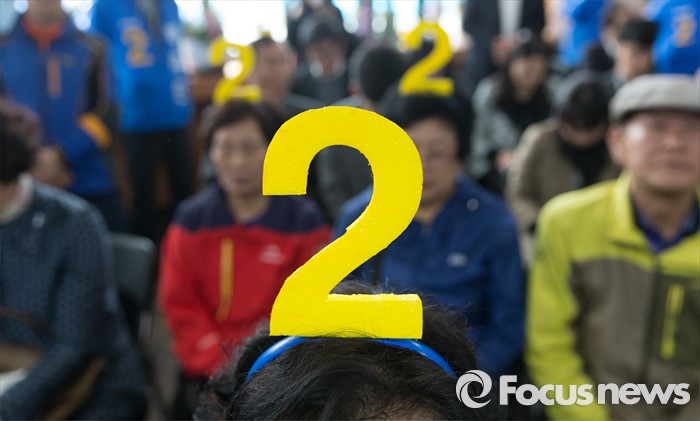 (서울=포커스뉴스) 8일 오전 서울 은평구 응암로 박주민 은평구갑 후보 사무실에서 열린 중앙선거대책위원회 회의에 참석한 지역 어르신들이 2번 머리띠를 착용하고 있다.