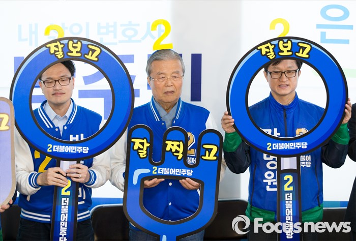 (서울=포커스뉴스) 김종인(오른쪽) 더불어민주당 비대위 대표 겸 선대위원장이 8일 오전 서울 은평구 응암로 박주민 은평구갑 후보 사무실에서 중앙선거대책위원회 회의 전 박(왼쪽) 후보와 2번 머리띠를 착용하고 지역 어르신들과 기초노령연금인상 공약 퍼포먼스를 하고 있다.