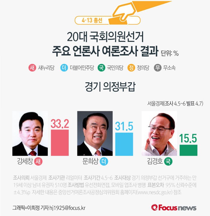 (서울=포커스뉴스) 서울경제가 리얼미터에 의뢰해 5~6일 실시한 경기 의정부갑 여론조사 결과에 따르면 새누리당 강세창 후보의 지지율은 33.2%, 더불어민주당 문희상 후보의 지지율은 31.5%, 국민의당 김경호 후보는 15.5%로 나타났다.