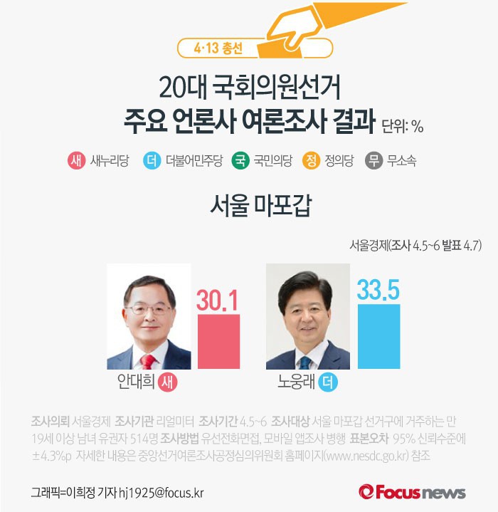 (서울=포커스뉴스) 서울경제가 리얼미터에 의뢰해 5~6일 실시한 서울 마포갑 여론조사 결과에 따르면 새누리당 안대희 후보의 지지율은 30.1%, 더불어민주당 노웅래 후보의 지지율은 33.5%로 나타났다.