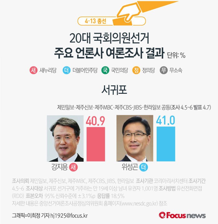 (서울=포커스뉴스) 제주신보와 제민일보, 한라일보, 제주MBC, 제주CBS, JIBS제주방송 등 제주지역 언론 6사가 코리아리서치센터에 의뢰해 5~6일 실시한 서귀포 여론조사 결과에 따르면 새누리당 강지용 후보의 지지율은 40.9%, 더불어민주당 위성곤 후보의 지지율은 41.0%로 나타났다.