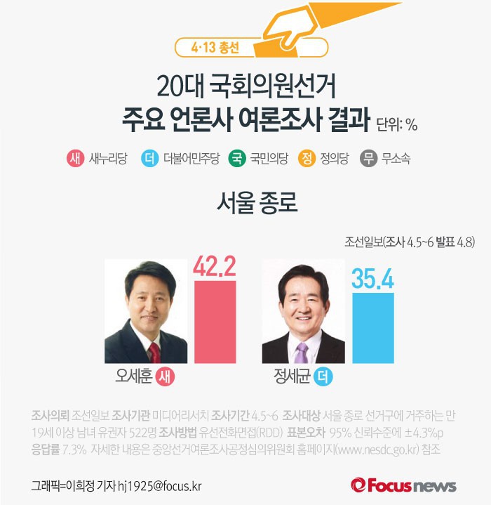 (서울=포커스뉴스) 조선일보가 미디어리서치에 의뢰해 5~6일 실시한 서울 종로 여론조사 결과에 따르면 새누리당 오세훈 후보의 지지율은 42.2%, 더불어민주당 정세균 후보의 지지율은 35.4%로 나타났다.