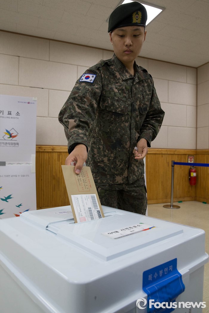 (고양=포커스뉴스) 20대 총선 사전투표가 시작된 8일 오전 군인들이 고양시 일산동구 식사동 주민센터에 마련된 사전투표소를 찾아 투표를 하고 있다.