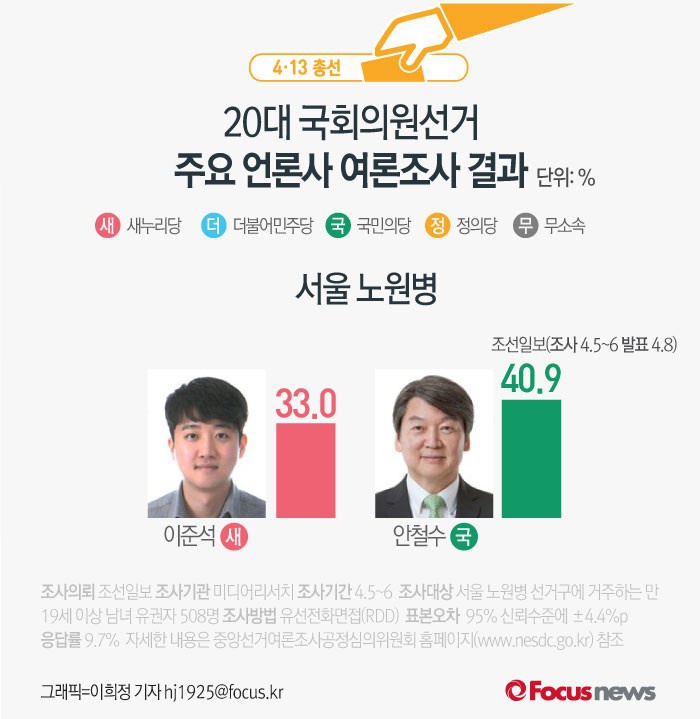 이번 조선일보 여론조사는 5~6일 서울 노원병에 거주하는 만 19세 이상 남녀 506명을 대상 유선전화면접조사 방식으로 진행됐다. 표본오차는 95% 신뢰 수준에 ±4.4%p다.