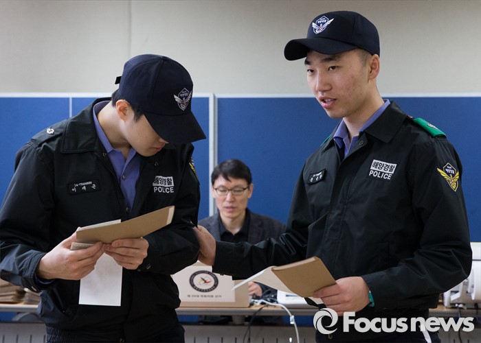 (인천=포커스뉴스) 제20대 국회의원 선거 사전투표 시작일인 8일 오전 인천 연수구 송도1동 주민센터에서 인천 중부해양경비안전본부 소속 해경들이 투표용지를 살펴보고 있다.