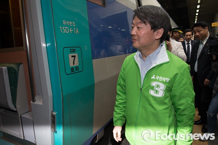 (서울=포커스뉴스) 4.13총선 사전투표 첫째날인 8일 오전 서울 용산구 서울역에서 안철수 국민의당 상임공동대표가 사전투표 격려 후 대전으로 가는 KTX를 탑승하고 있다.