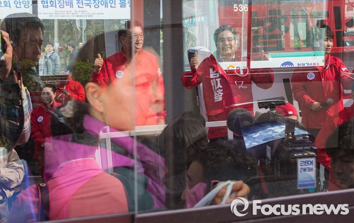 (안양=포커스뉴스) 8일 오전 경기 안양시 범계역 인근에서 열린 심재철 새누리당 안양동을 후보 지원유세에서 버스 안의 시민들이 유세현장을 지켜보고 있다.