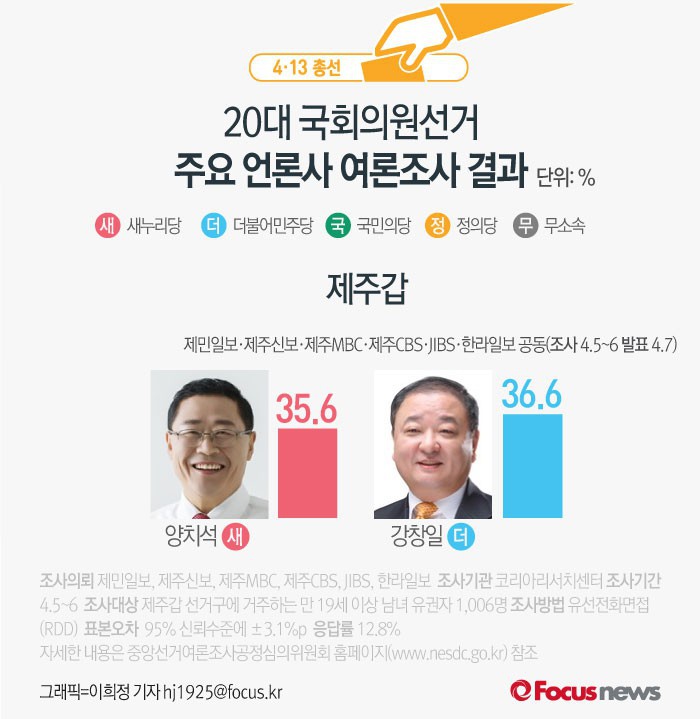 자세한 내용은 중앙선거여론조사공정심의위원회 홈페이지(www.nesdc.go.kr)에서 찾아볼 수 있다.(서울=포커스뉴스) 제주신보와 제민일보, 한라일보, 제주MBC, 제주CBS, JIBS제주방송 등 제주지역 언론 6사가 코리아리서치센터에 의뢰해 5~6일 실시한 제주갑 여론조사 결과에 따르면 새누리당 양치석 후보의 지지율은 35.6%, 더불어민주당 강창일 후보의 지지율은 36.6%로 나타났다. 2016.04.08 이희정 기자