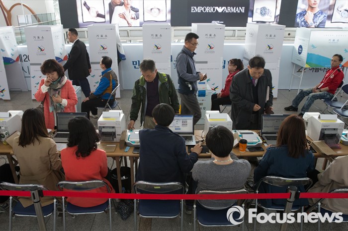 (서울=포커스뉴스) 4.13총선 사전투표 첫째날인 8일 오전 서울 용산구 서울역에 설치된 남영동 사전투표소에서 시민들이 투표를 하고 있다. 사전투표는 4.8~4.9일까지 진행된다.