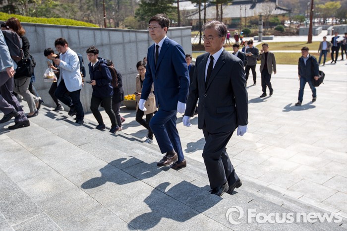 (광주=포커스뉴스) 문재인 더불어민주당 전 대표와 김홍걸 국민통합위원장이 8일 오전 전남 광주 5.18 민주묘지를 방문해 민주항쟁 추모탑으로 이동하고 있다.