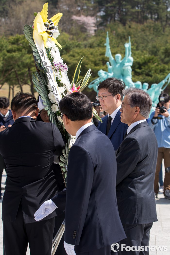(광주=포커스뉴스) 문재인 더불어민주당 전 대표와 김홍걸 국민통합위원장이 8일 오전 전남 광주 5.18 민주항쟁 추모탑을 찾아 헌화 하고 있다.