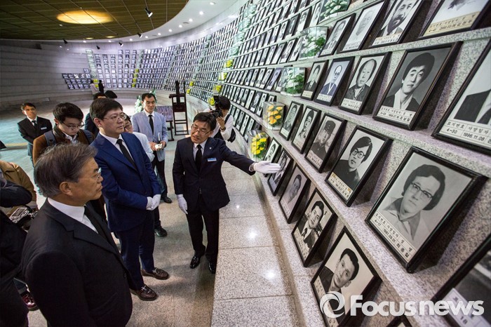 (광주=포커스뉴스) 문재인 더불어민주당 전 대표와 김홍걸 국민통합위원장이 8일 오전 전남 광주 5.18 민주묘지 내 유영봉안소를 방문 하고 있다.