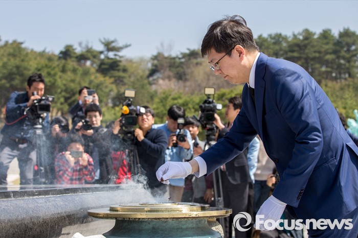 (광주=포커스뉴스) 김홍걸 국민통합위원장이 8일 오전 전남 광주 5.18 민주항쟁 추모탑을 찾아 분향 하고 있다.
