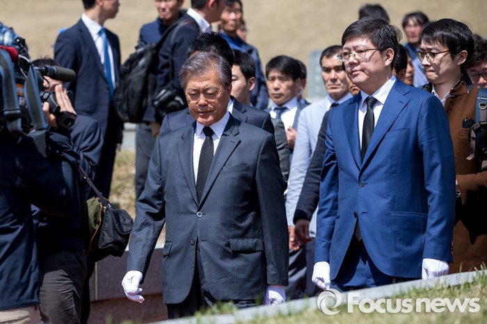 (광주=포커스뉴스) 문재인 더불어민주당 전 대표와 김홍걸 국민통합위원장이 8일 오전 전남 광주 5.18 민주묘지를 찾아 민주열사 묘지를 둘러 보고 있다.