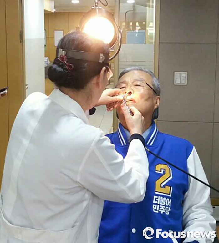 (인천=포커스뉴스) 김종인 더불어민주당 비대위 대표 겸 선대위원장이 8일 오전 인천시 지원유세 도중 부평역의 한 이비인후과에서 목 진료를 받고 있다. <사진제공=더불어민주당>