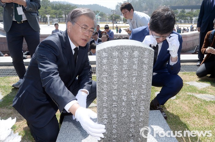 | △ 윤상원 묘비 살피는 문재인 |