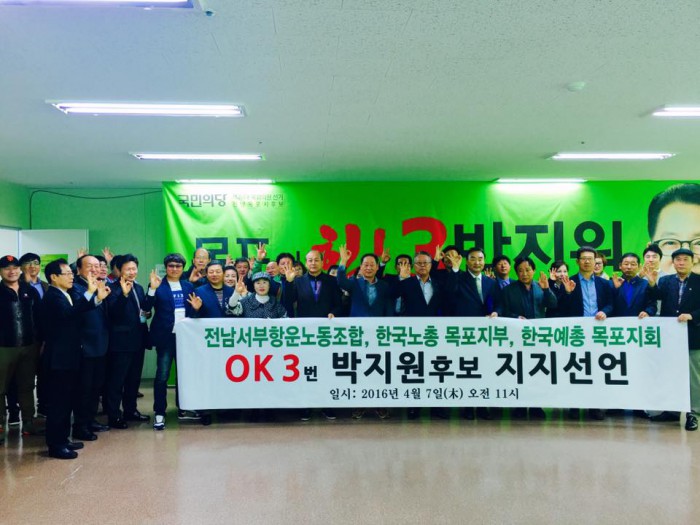 (서울=포커스뉴스) 전남서부항운노동조합, 한국노동조합총연맹 전남본부 목포지역지부, 한국문화예술단체총연합회 목포지회가 4.13 총선에서 박지원 국민의당 박지원 후보(전남 목포)에 대한 지지를 선언했다.