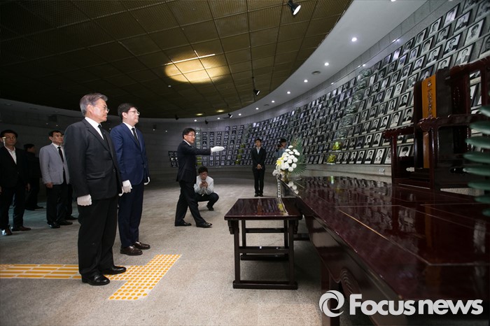 (광주=포커스뉴스) 20대 총선이 5일 남은 8일 오전 더불어민주당 문재인 전 대표가김홍걸 국민통합위원장과 함께 광주 북구 국립5.18민주묘지 내 유영봉안소를 방문해 참배 후 영정을 살펴보고 있다.
