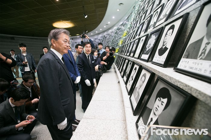 (광주=포커스뉴스) 20대 총선이 5일 남은 8일 오전 더불어민주당 문재인 전 대표가김홍걸 국민통합위원장과 함께 광주 북구 국립5.18민주묘지 내 유영봉안소를 방문해 참배 후 영정을 살펴보고 있다.