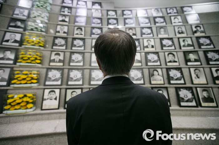 (광주=포커스뉴스) 문재인 더불어민주당 전 대표가김홍걸 국민통합위원장과 함께 8일 오전 광주 북구 국립5.18민주묘지 내 유영봉안소를 방문해 참배 후 영정을 살펴보고 있다.