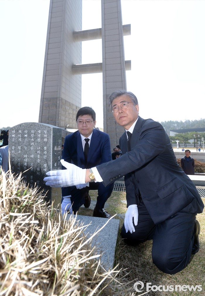 (광주=포커스뉴스) 8일 오전 광주 국립 518묘지를 찾은 더불어민주당 문재인(오른쪽) 전 대표와 김홍걸 국민통합위원장이 묘역을 참배하고 있다.