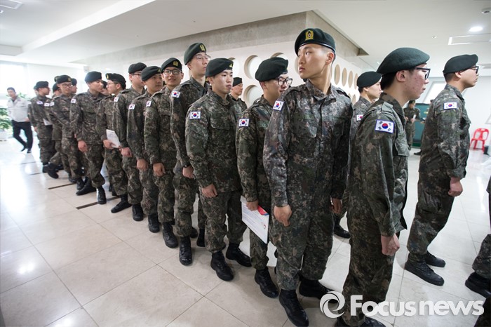 (서울=포커스뉴스) 4.13총선 사전투표 첫째날인 8일 오후 서울 서초구 방배4동 주민센터에 설치된 사전투표소에서 수방사 장병들이 투표를 하기위해 기다리고 있다.