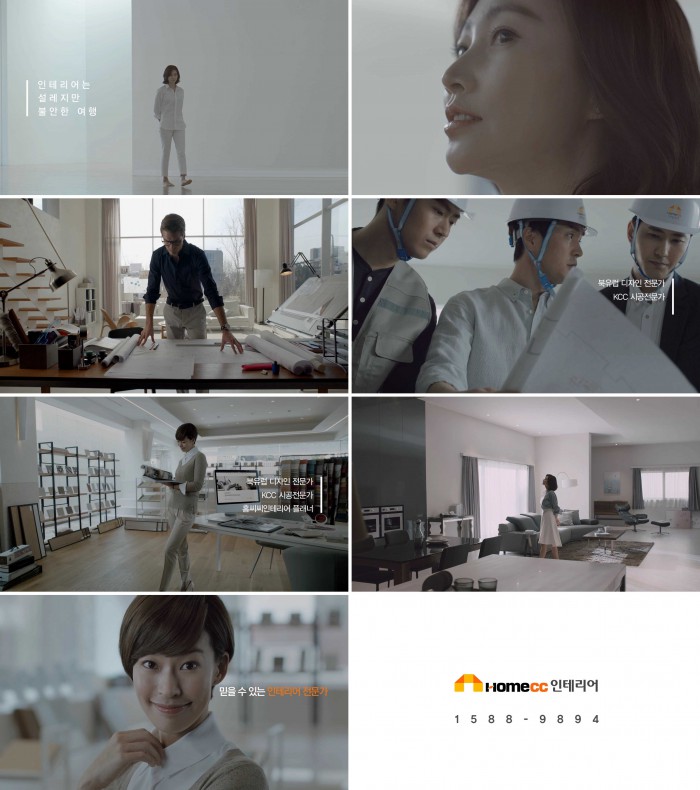홈씨씨인테리어의 고급스럽고 세련된 패키지 인테리어를 광고에서 그대로 보여주기 위해 실제 전시판매장 쇼룸에 디자인을 시공하고 제작·촬영했다. 또한 실제 KCC에서 영업을 담당하고 있는 사내 모델 이승재씨를 광고 속 시공전문가로 등장시켜 현장감을 살렸다.<사진제공=KCC>
