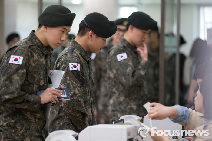 (서울=포커스뉴스) 4.13총선 사전투표 첫째날인 8일 오후 서울 서초구 방배4동 주민센터에 설치된 사전투표소에서 수방사 장병들이 투표를 하기위해 기다리고 있다.
