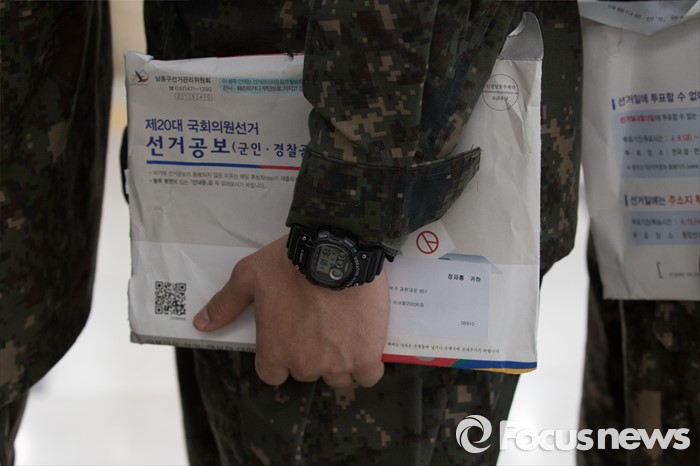 (서울=포커스뉴스) 4.13총선 사전투표 첫째날인 8일 오후 서울 서초구 방배4동 주민센터에 설치된 사전투표소에서 수방사 장병들이 투표를 하기위해 기다리고 있다.