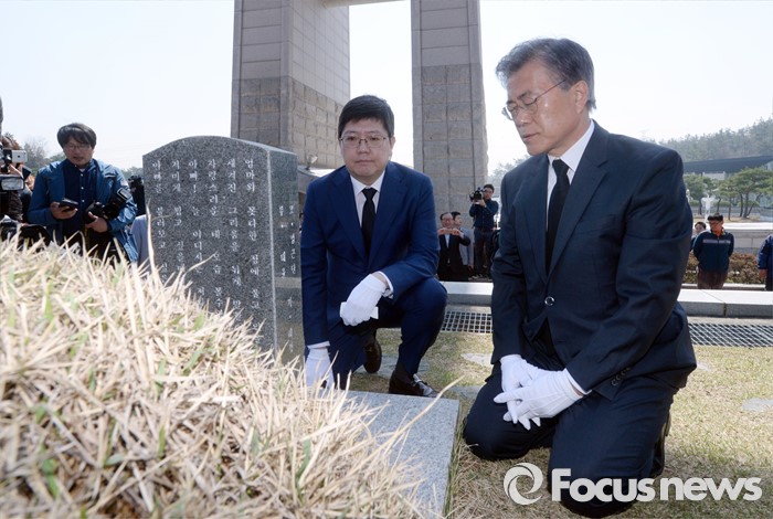 김 위원장은 이어 "저는 그 뜻을 받아 끝까지 최선을 다해서 그동안 저의 아버지 보호하시고 키워주셔서 대통령까지 만들어주신 여러분들의 은혜에 보답하고 김대중 전 대통령의 명예를 지킬 것"이라며 "여러분들의 염원, 또 저의 어머니의 소원인 정권교체를 꼭 이루도록 끝까지 최선을 다하겠다"고 강조했다.8일 오전 광주 국립 518묘지를 찾은 더불어민주당 문재인(오른쪽) 전 대표와 김홍걸 국민통합위원장이 묘역을 참배하고 있다. 2016.04.08 강진형 기자