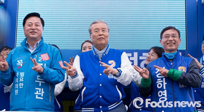 (김포=포커스뉴스) 김종인(가운데) 더불어민주당 비대위 대표 겸 선대위원장이 8일 오후 경기 김포 장기사거리에서 김두관(왼쪽) 김포시갑 후보와 정하영(오른쪽) 김포시을 후보 합동지원유세를 하고 있다.